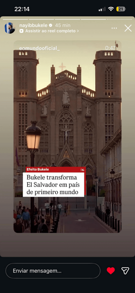 Na noite deste sábado, 25, o presidente de El Salvador, Nayib Bukele, compartilhou em suas redes sociais uma publicação do É O MUNDO, em mais um sinal do alcance internacional que a página brasileira vem conquistando. O compartilhamento partiu do perfil oficial do chefe de Estado salvadorenho e reforçou a projeção do veículo para além do debate nacional, colocando seu conteúdo em circulação também entre públicos e lideranças de relevância fora do Brasil.