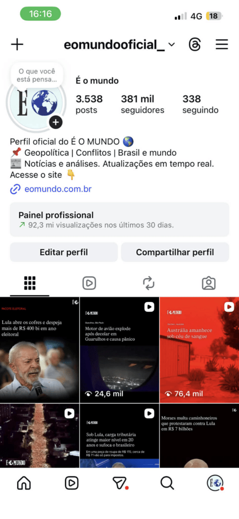 Os números do perfil ajudam a dimensionar esse crescimento. Segundo os dados da Meta exibidos na própria conta, o É O MUNDO registrou mais de 92 milhões de visualizações nos últimos 30 dias, mantendo uma média próxima de 100 milhões de visualizações por mês. Além disso, a página também vem alcançando média superior a 8 milhões de interações mensais, desempenho que a coloca entre as maiores páginas de geopolítica do país.