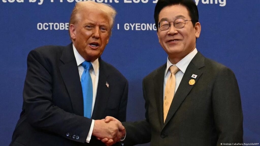 O presidente sul-coreano, Lee Jae Myung, e Donald Trump, em visita ao país em outubro Foto: Andrew Caballero-Reynolds/AFP