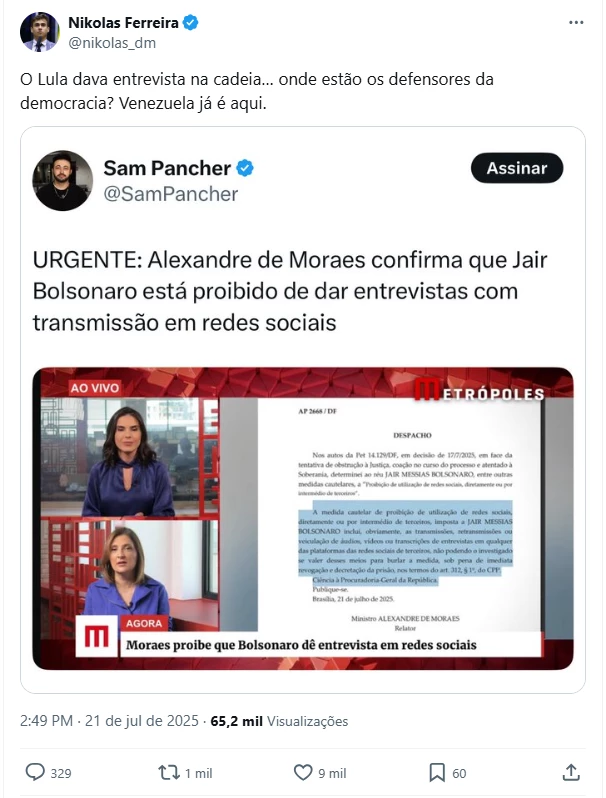 Nas redes sociais, Nikolas ironizou a medida e comparou a situação do Brasil à de regimes autoritários.