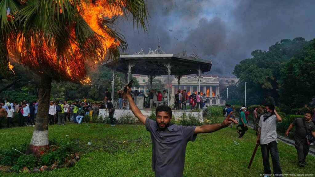 Manifestantes atearam fogo no Congresso do Nepal após um veto a redes sociais no país Foto: Niranjan Shrestha/AP Photo/picture alliance